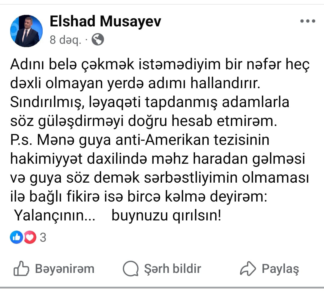 Elşad Musayev ona aid edildiyi iddia olunan anti-Amerikan tezisinin guya hakimiyyət daxilindən gəlməsi və söz demək sərbəstliyinin olmaması ilə bağlı fikirlərə münasibət bildirib.