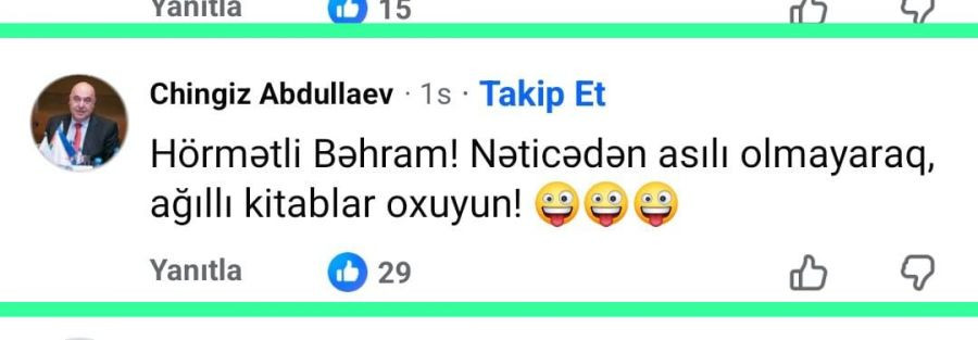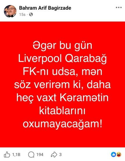 Əməkdar artist Bəhram Bağırzadənin ötən gün UEFA Çempionlar Liqasında “Qarabağ” və “Liverpul” komandalarının oyunu ilə bağlı paylaşımı müzakirə yaradıb. B.Bağırzadənin “Əgər bu gün “Liverpul” “Qarabağ” futbol klubunu udsa, daha heç vaxt Kəramət Böyükçölün kitablarını oxumayacağam!” sözlərinə Azərbaycan Yazıçılar Birliyinin katibi, Xalq yazıçısı Çingiz Abdullayevin yazdığı “Nəticədən asılı olmayaraq ağıllı kitablar oxuyun!” şərhi də diqqətdən qaçmayıb. B.Bağırzadəyə gələn tənqidlərin arasında Çingiz Abdullayev də Böyükçöl sevərlər tərəfindən linç edilib, sonra Ç.Abdullayev şərhini silib.