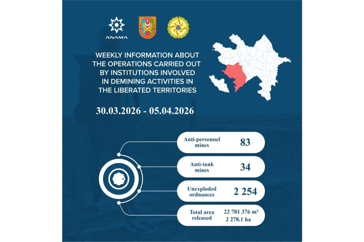İşğaldan azad edilmiş ərazilərdə minatəmizləmə fəaliyyətinə cəlb olunmuş qurumlar tərəfindən icra olunan əməliyyatlar barədə həftəlik (30.03.2026 – 05.04.2026) məlumat açıqlanıb.Azərbaycan Respublikasının Minatəmizləmə Agentliyindən (ANAMA) Citypost.az-a verilən məlumata görə, Tərtər, Ağdam, Ağdərə, Laçın, Füzuli, Şuşa, Xocalı, Xankəndi, Kəlbəcər, Xocavənd, Cəbrayıl, Qubadlı və Zəngilanda, o cümlədən Qazax rayonunun işğaldan azad edilmiş Bağanıs Ayrım, Aşağı Əskipara, Xeyrımlı, Qızılhacılı kəndlərində 83 piyada əleyhinə mina, 34 tank əleyhinə mina, 2254 Partlamamış Hərbi Sursat (PHS) aşkarlanıb.Bildirilib ki, 2278,1 hektar ərazi mina və PHS-lərdən təmizlənib....