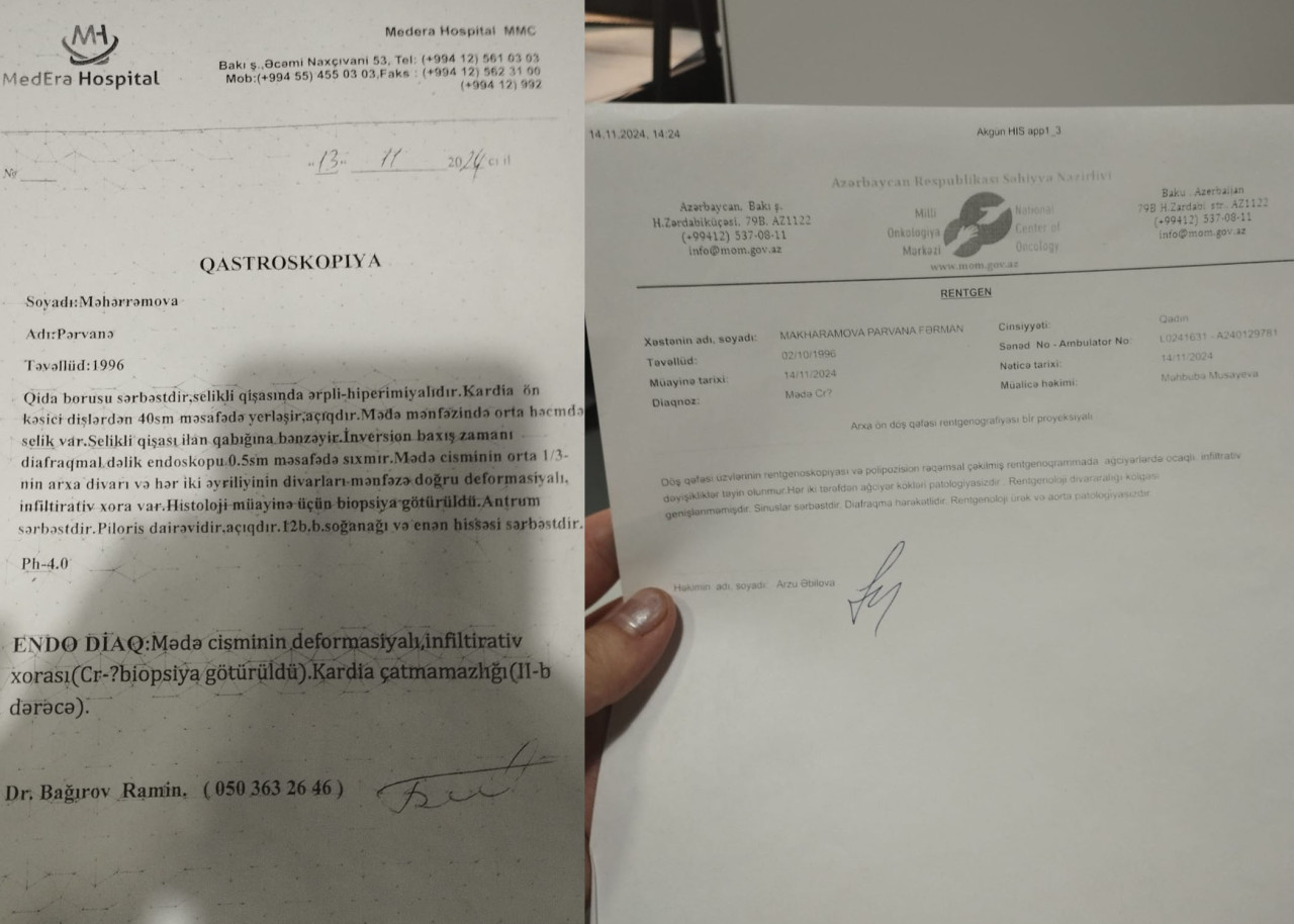 “Vətəndaş bizə müayinə üçün müraciət edib. Biz onu qastroskopiya etmişik.Müayinələr nəticəsində ona mədə cisminin deformasiyalı infiltrativ xorası,kardia çatmamazlığı (II b dərəcə) və Cr? diqnozu qoyulub. Biz xəstəyə xərçəng diqnozunu qoymamışıq. Həmin diqnozu Milli Onkologiya Mərkəzi qoyur”,-deyə həkim bildirib.